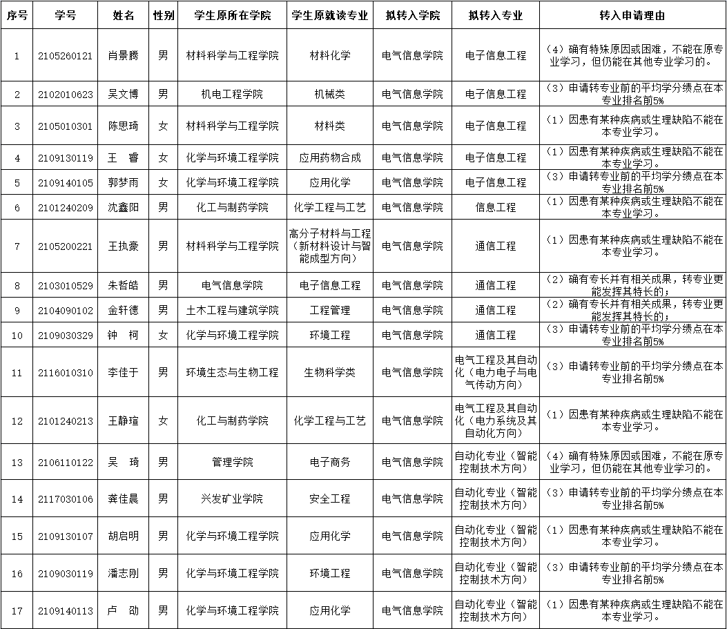 根据《武汉工程大学本科生专业调整暂行规定》文件有关规定和学校教务处《关于做好2021-2022学年第二学期普通本科生转专业工作的通知》的有关要求,拟同意肖景腾等17名学生转专业申请,现将名单予以公示(公示期为2022年6月8日~2022年6月14日)。如对以下公示名单有异议,请于2022年6月14日12点前联系贺老师:联系电话:027-87992157。
