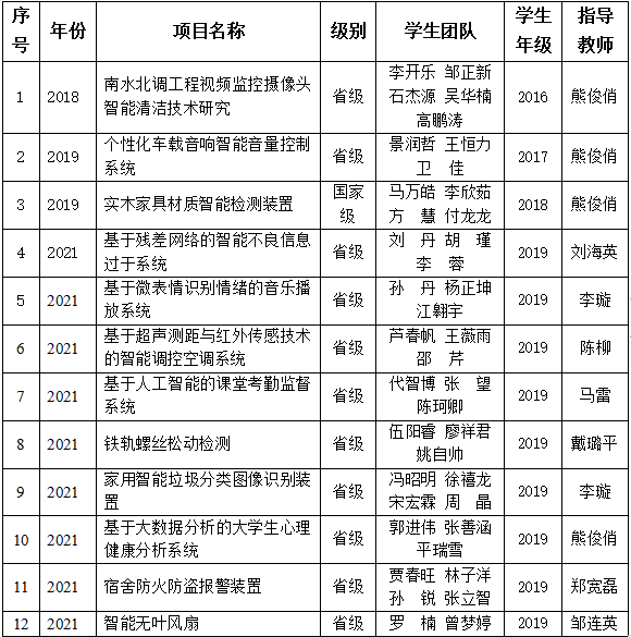 信息工程专业自2016年首批招生,通过不断优化专业培养计划,理论教学与技能培养相结合,培养大学生创新意识、创新精神和创造能力;坚持每年邀请专家进校介绍知识产权与专利申报知识,对口高新技术企业(如烽火、华为、小米、科大讯飞、海康威视)开展专业认识实习,引导学生重视科技创新、了解技术前沿,同时邀请中小微企业(如数为科技、全华光电)介绍企业创业和技术创新历程;坚持本科生导师制,以项目引导学生开展课外科技活动,增强学生就业竞争力,取得良好效果。2016级、2017级和2018级分别获得省级创新训练2项和国家级创新训练1项,专业毕业生报考硕士研究生方向大多对口人工智能、大数据等高新技术领域,本科就业率保持100%,部分学生就业薪金达到硕士研究生层次。