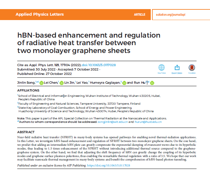 论文信息:Jinlin Song,Lei Chen, Lin Jin, Lei Yao, HumeyraCaglayan,and Run Hu, hBN-based enhancement and regulation of radiative heat transfer between two monolayer graphene sheets, Applied Physics Letters, 2022, 121(17), 171104