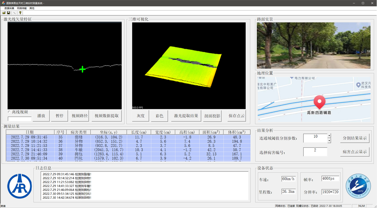 研制的道路表面智能检测系列装备通过了国家道路检测设备计量站测试,研发的软件通过了中国软件评测中心技术鉴定测评,主要技术指标为:可以实现道路表面激光线实时采集,可以在白天和晚上采集。线激光像素检出正确率和提取完整率均为98%,激光线提取耗时3.22ms/帧,道路缺陷检测精度0.5mm。对道路坑槽、沉陷、异物、拥包等病害类,自动识别准确率92.88%;对裂缝类病害,自动识别准确率95.20%,全类型路面病害识别速度为109.8km/h。在远程终端可实时进行三维可视化。