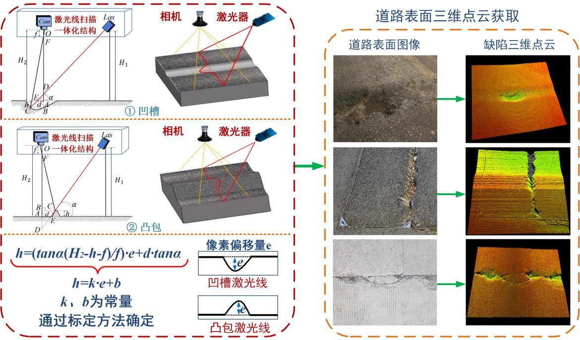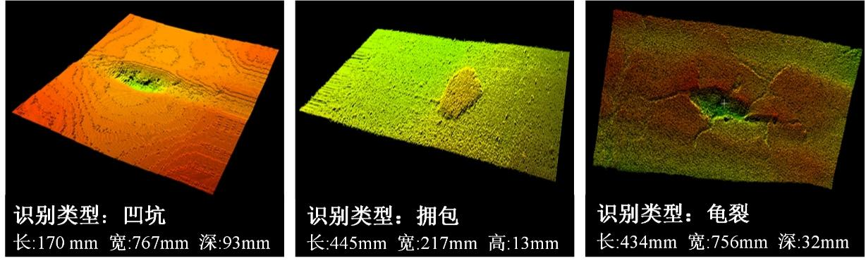 提出了道路表面缺陷形态三维点云数据拓扑分析方法和基于精细化三维建模的道路表面缺陷病害检测方法,实现了对坑槽、拥包、裂缝等典型表面病害的准确识别、分类和测量。