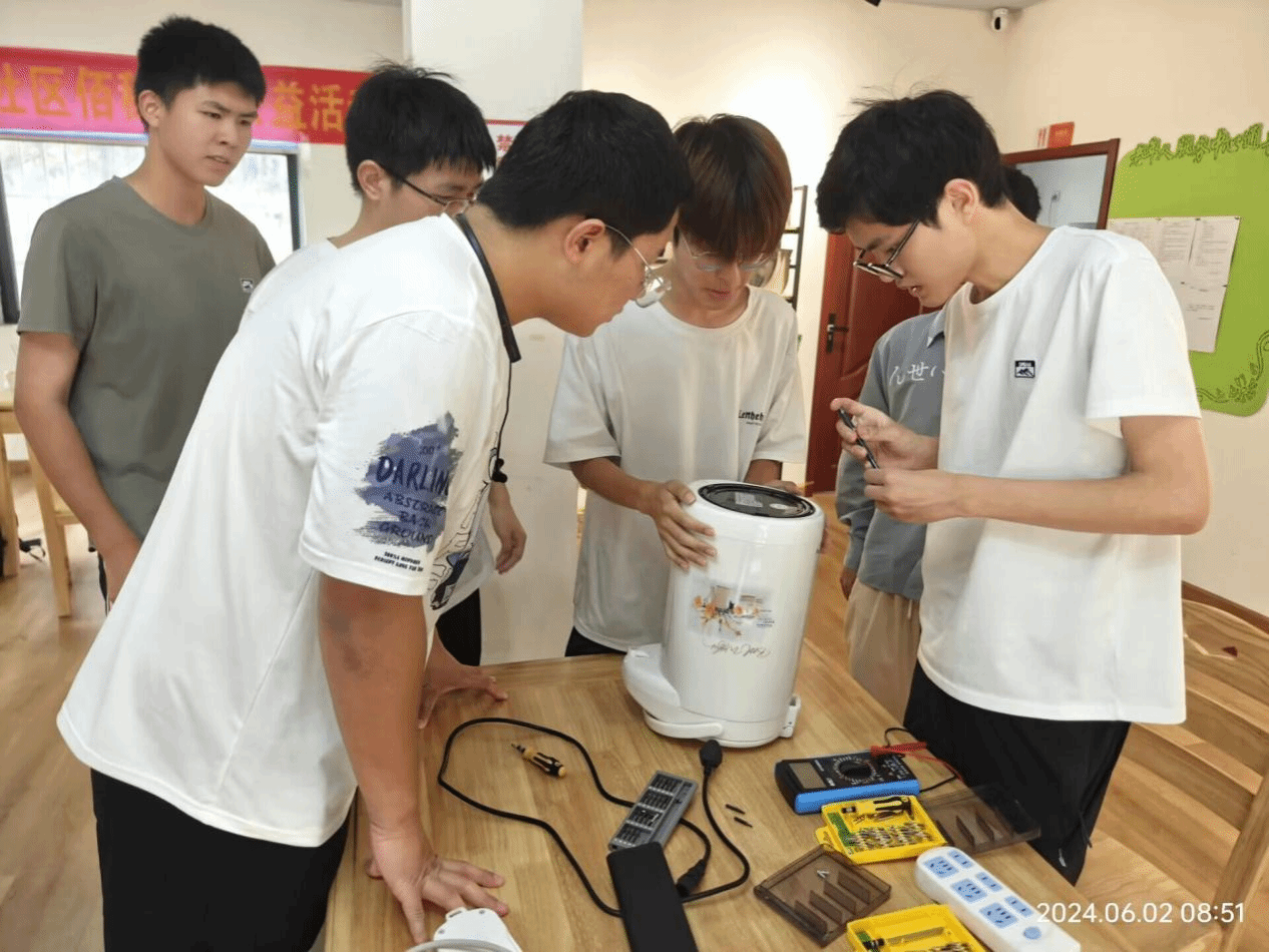 在其他活动进行的时候,电器维修队的成员们也在同步开展维修电器活动,同时给居民们讲解电器使用与维修知识。经过志愿者们的认真检查和专业维修,让每一件故障小家电焕发出新的生机。通过志愿服务不仅提升了维修队成员们的实践操作能力,也培养了他们的团队合作能力。