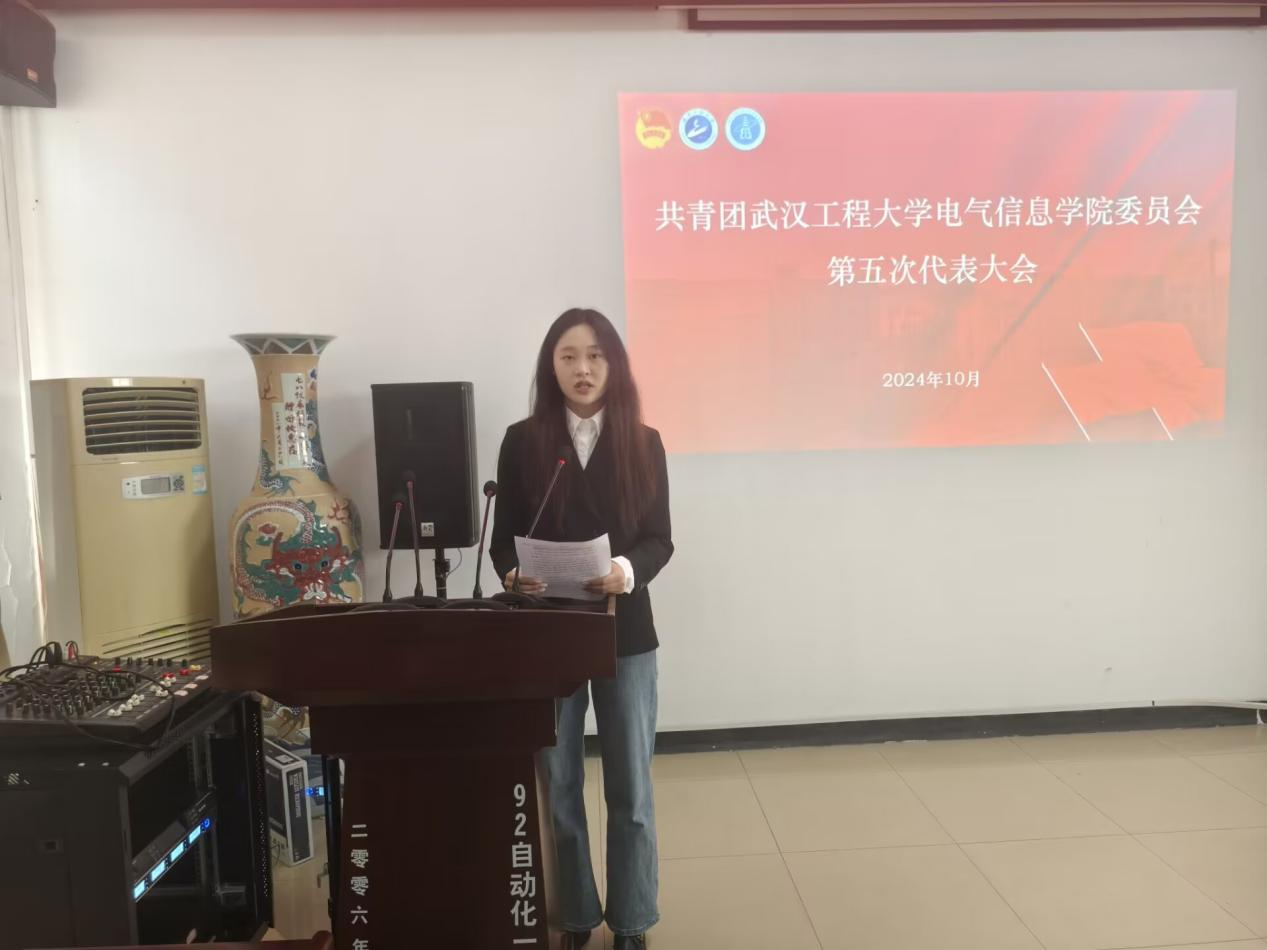 廖巧巧代表共青团武汉工程大学伟德(bevictor)官方网站第四届委员会向大会作工作报告,全面总结了过去6年学院团委在思想引领、组织建设、创新创业、学科竞赛、服务青年、志愿服务和社会实践等方面取得的成绩,同时剖析当前学院共青团工作面临的机遇和挑战,并提出了未来一段时期的工作思路和规划。