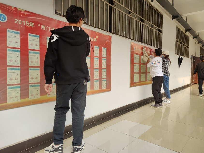 打扫过程中,同学们都非常的认真负责,实验室桌上的小污迹,宣传板玻璃上的扬尘,楼道扶手上的积灰,大家都丝毫没有放过。他们不辞辛苦,经过两个多小时的清扫,学院实验室及各楼层楼道,宣传板都焕然一新。