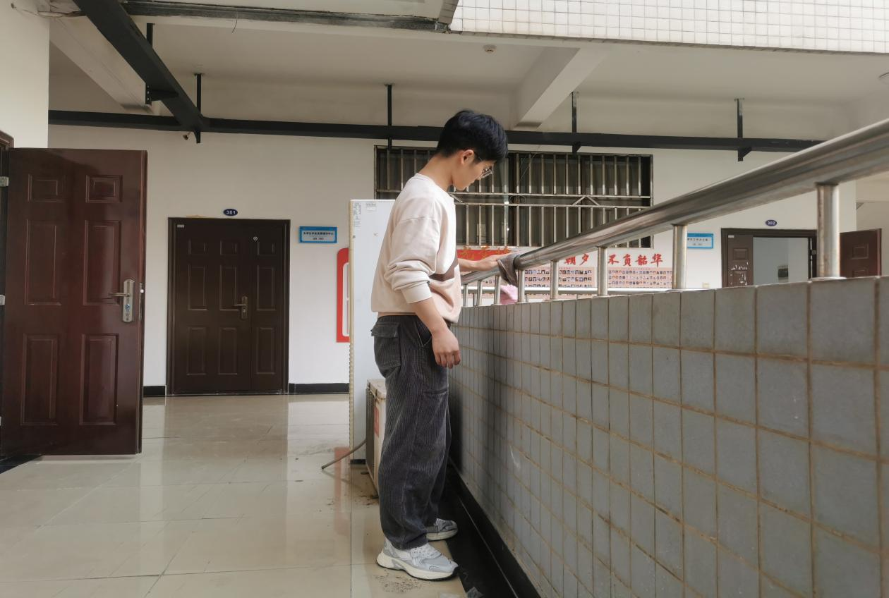 本次服务活动内容主要为打扫学院实验室及清理楼道扶手,门牌、宣传展板等。同学们在学院一楼大厅集合完毕后就拿着自带的工具分组到指定区域进行清洁打扫。