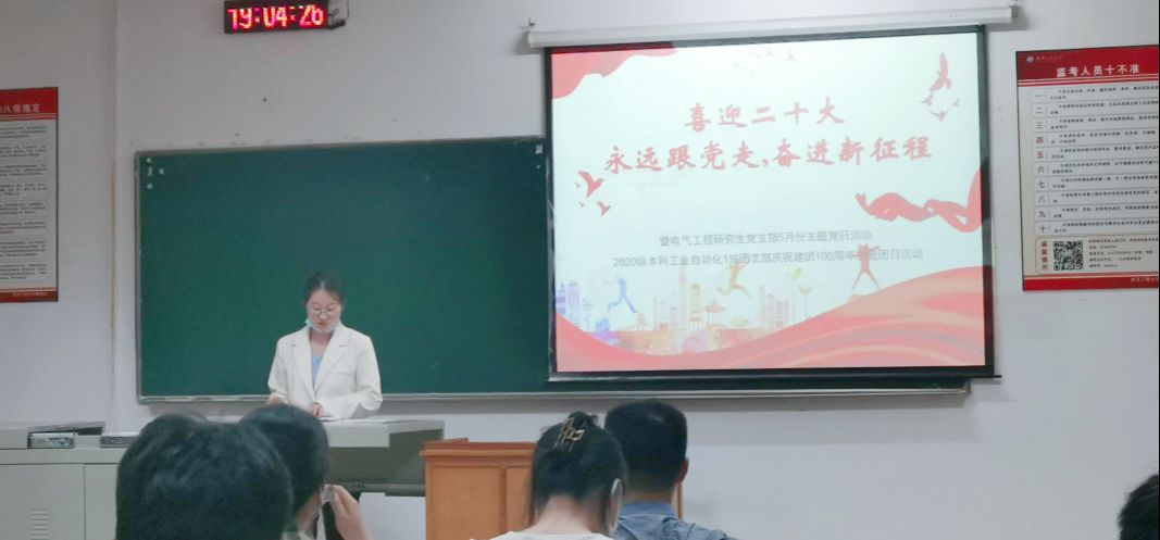 本网讯(通讯员 黄光亮 魏小萌 徐琪)2022年是新时代新征程中具有特殊重要意义的一年,是党的二十大召开之年,也是中国共产主义青年团成立100周年。5月19日,伟德(bevictor)官方网站电气工程研究生党支部与2020级本科工业自动化1班团支部开展“喜迎党的二十大 永远跟党走 奋进新征程”为主题的党建带团建联谊活动。本次活动旨在通过主题宣讲、分享交流的方式,学习党领导中国青年运动的光辉历程,引导青年大学生深刻领悟“两个确立”的决定性意义,深入落实习近平总书记关于青年工作的重要思想,踏上新征程,不等不靠,锚定目标,勇毅前进!