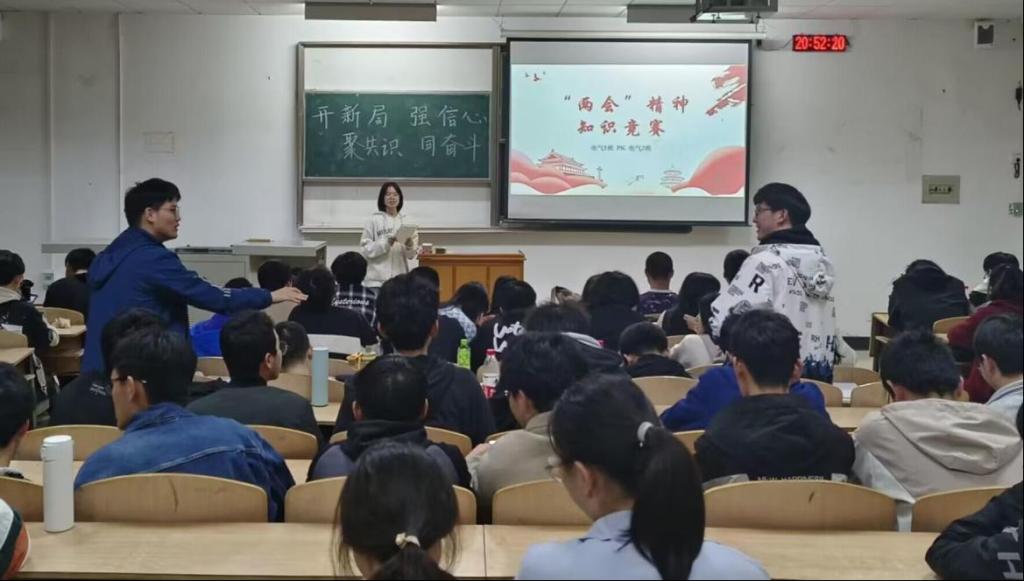 3月30日晚,2022级电气工程及其自动化1、2班开展“两会”知识竞赛。“2023年两会于何时召开?”“会议的议程是什么?”“2023年的《政府工作报告》展现出了我国的哪些新突破?”“新时代新征程新伟业下,我们该如何更好的学习贯彻党的二十大精神?”。通过生动有趣的抢答环节,同学们深入了解了2023年全国两会的会议进程与热点话题,对人民代表大会制度这一我国根本政治制度和国家治理体系的重要组成部分——中国人民政治协商会议的性质、地位及重要意义有了更加清楚的认识,进一步领会中国国情,提高了政治理论修养和思想道德素质。