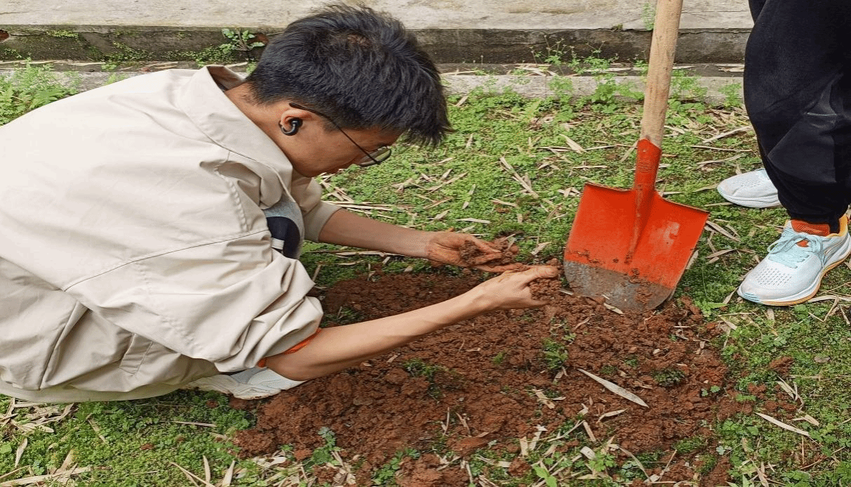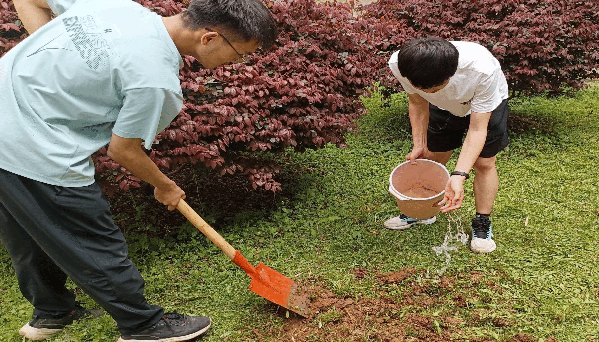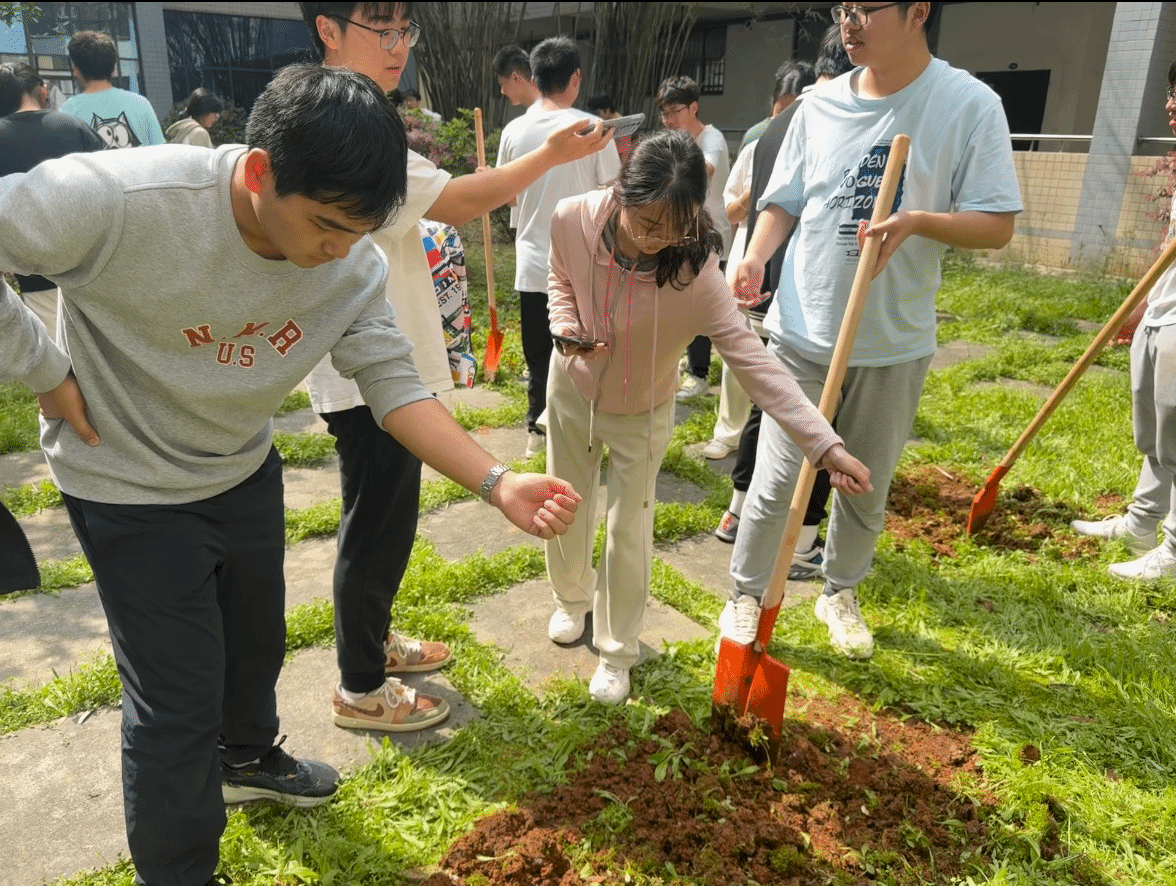 在辅导员邬桢洁的带领下,同学们拿起工具纷纷行动起来,大家分工明确,配合默契,有条不紊地展开了松土、平整、播种、浇水等工作。翻土和播种的过程并不轻松,但同学们的脸上却洋溢着快乐和满足的笑容。手握铁锹热情地投入到挖地除杂的活动中,经过一番辛勤劳作,原本荒芜的土地焕然一新,新鲜的泥土散发着沁人心脾的芬芳,等待着绿意盎然的树苗在此扎根生长。