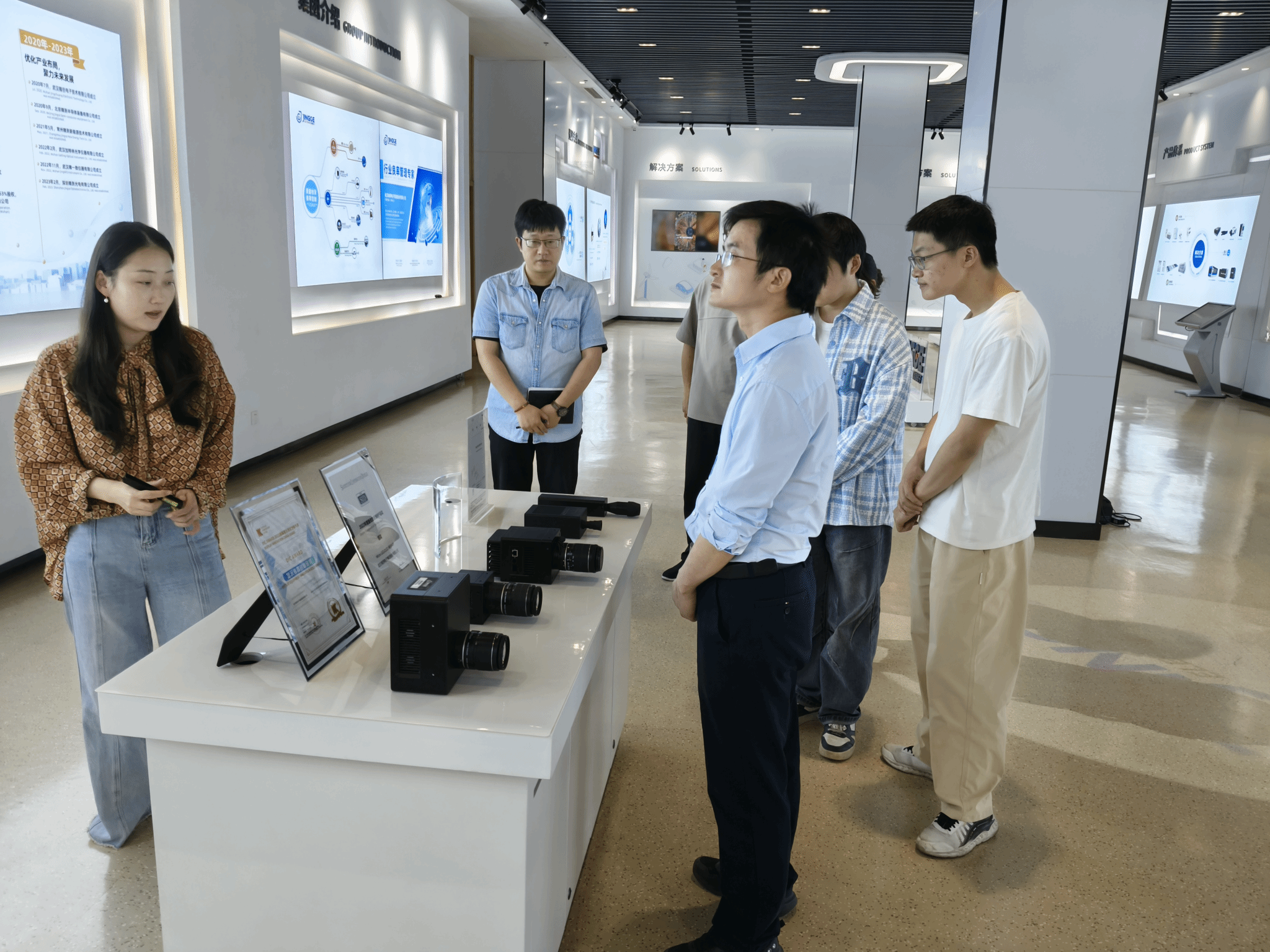 周磊一行参观了武汉精测电子股份有限公司展厅,了解了光学检测与半导体行业的发展现状,以及企业核心产品的研发流程与应用前景。