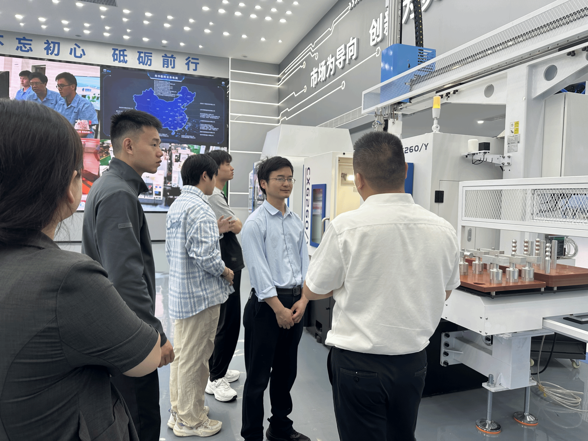 周磊一行前往华中数控智能制造展厅,近距离观摩了公司自主研发的‌五轴联动数控系统‌、智能产线解决方案及工业机器人等产品。李亚磊现场展示了数控机床的精密加工过程,重点介绍了公司产品在航空航天、汽车制造、产教融合等领域的突破性应用。