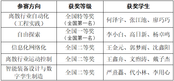 决赛中我校参赛队伍展现出色的创新实践能力和团队协作精神,学生何泽宇、张江驰、廖巧巧组成的参赛团队获得了离散行业自动化(工程实践)方向全国特等奖第一名的佳绩,李小白、高日新、杨卓鸣组成的参赛团队荣获自由探索方向全国一等奖第一名。2021级电气工程及其自动化专业廖巧巧同学荣获最佳女性工程师奖。