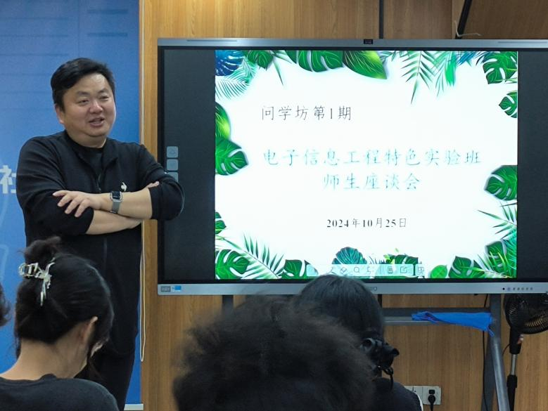 杨志芳与同学们进行了深入交流,对同学们高考取得的优异成绩表示充分肯定,提出了“我是谁,我从哪里来,要到哪里去”的人生三问。他强调了自我认知的重要性,希望大家在大学学习中继续保持良好习惯,展现出特色实验班的风采,回答好“我是谁,我从哪里来”的问题。就如何回答好“我要到哪里去”的问题,杨志芳指出,同学们要树立正确的人生观、世界观和价值观,不断保持对科学和知识的探索。要结合专业与行业发展的趋势,为未来的学习与发展找准正确的方向和目标。要有超前规划意识,对自己所学专业永远保持朝气与热情,唯有热爱才能体会到专业的美妙之处,也唯有热爱才能坚持在专业的道路上一路披荆斩棘,实现自己的目标。针对特色实验班的“特色”问题,杨志芳从专业学习方向、专业导师制度以及特色学习模式几个方面展开,对电子信息工程特色实验班的培养方案进行了详细介绍。他期待同学们在四年的学习中都能收获扎实的理论基础与较强的实践能力。他鼓励同学们永远保持积极向上的心态,面对挫折永不放弃,遇到问题多思考,大胆尝试,敢于试错,多参加专业实践,保持对学术的渴望,始终走在专业的最前沿,用自己的努力与汗水实现既定的目标,在青春的画卷中留下浓墨重彩的一笔。