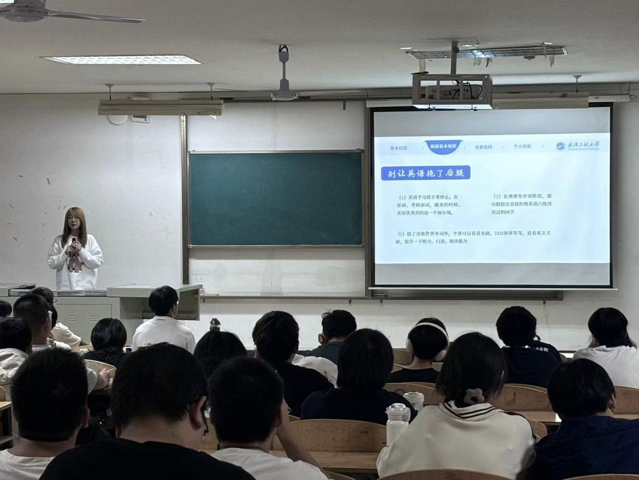阮子涵作为保研优秀学生代表,向新生们介绍了保研所需要准备的基础材料和一些必要的准备工作。她从保研基本知识、学科竞赛、复习备考等方面进行分享,建议同学们在努力学习的同时,积极参加学科竞赛和老师的科研项目。