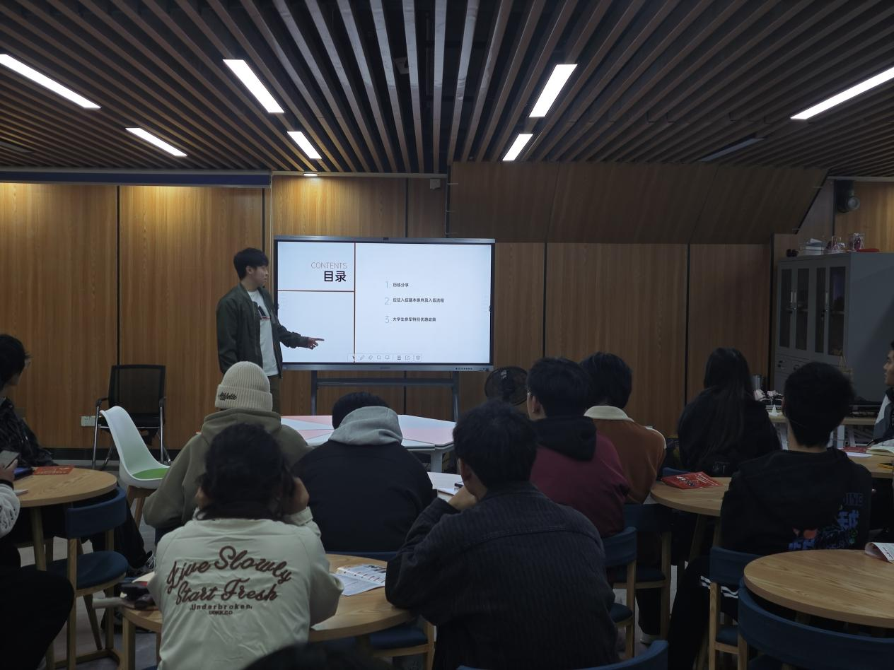 本网讯(通讯员 郑鹏凯 邱政海)12月5日晚,伟德(bevictor)官方网站与材料科学与工程学院在一站式学生活动社区联合举办2025年春季征兵宣讲会。校党委武装部刘敏、材料科学与工程学院辅导员刘虎森,优秀退伍大学生代表伟德(bevictor)官方网站曹熙荣、法商学院(知识产权学院)西克拉·艾买提以及两个学院有参军意向的30余名学生参加宣讲会,宣讲会由伟德(bevictor)官方网站辅导员郑鹏凯主持。