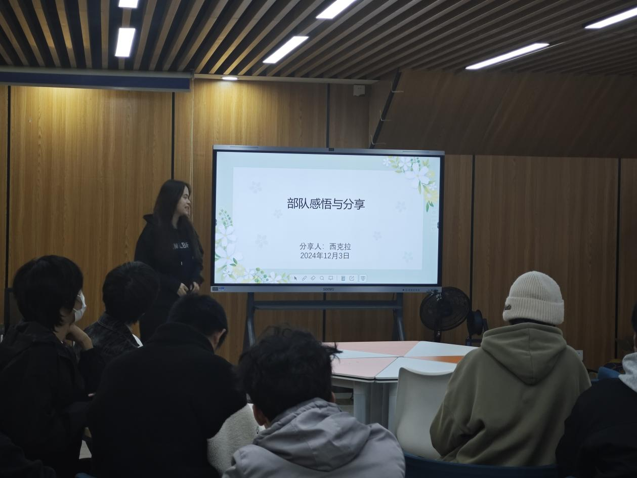曹熙荣详细介绍了应征入伍的基本条件、入伍流程以及大学生参军的优惠政策,他结合亲身经历,讲述了军队中的训练与挑战,阐释军人身份的深刻内涵,让大家对部队生活有了更加清晰的了解;西克拉·艾买提分享了作为女性军人的独特经历和感悟,讲述了自己在部队中的点点滴滴,从最初的迷茫和不适到后来的坚韧与成长。