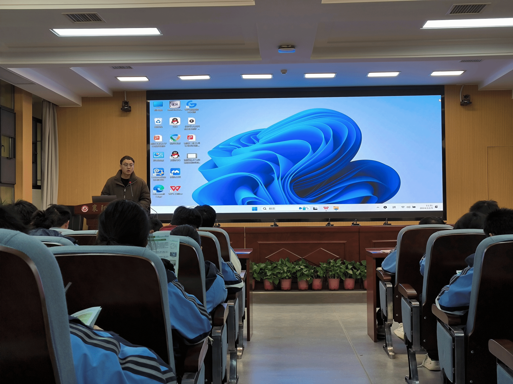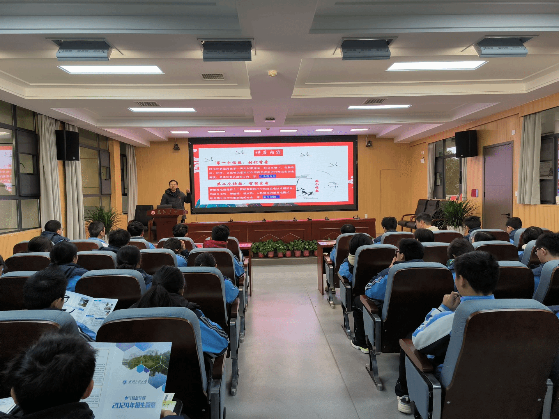 卓旭升以《人工智能技术在发电领域的应用》为题,为200余名襄阳三中学子带来科普讲座。他从新一轮科技革命和产业变革为背景入手,介绍了我国发电技术、电力工业的现状,燃煤发电厂的智慧化建设,我国电力工业的发展趋势,以及大数据、互联网、人工智能、深度学习、云计算等在电站智能化中的应用。卓旭升还播放了武汉工程大学测控技术与仪器专业介绍宣传片。