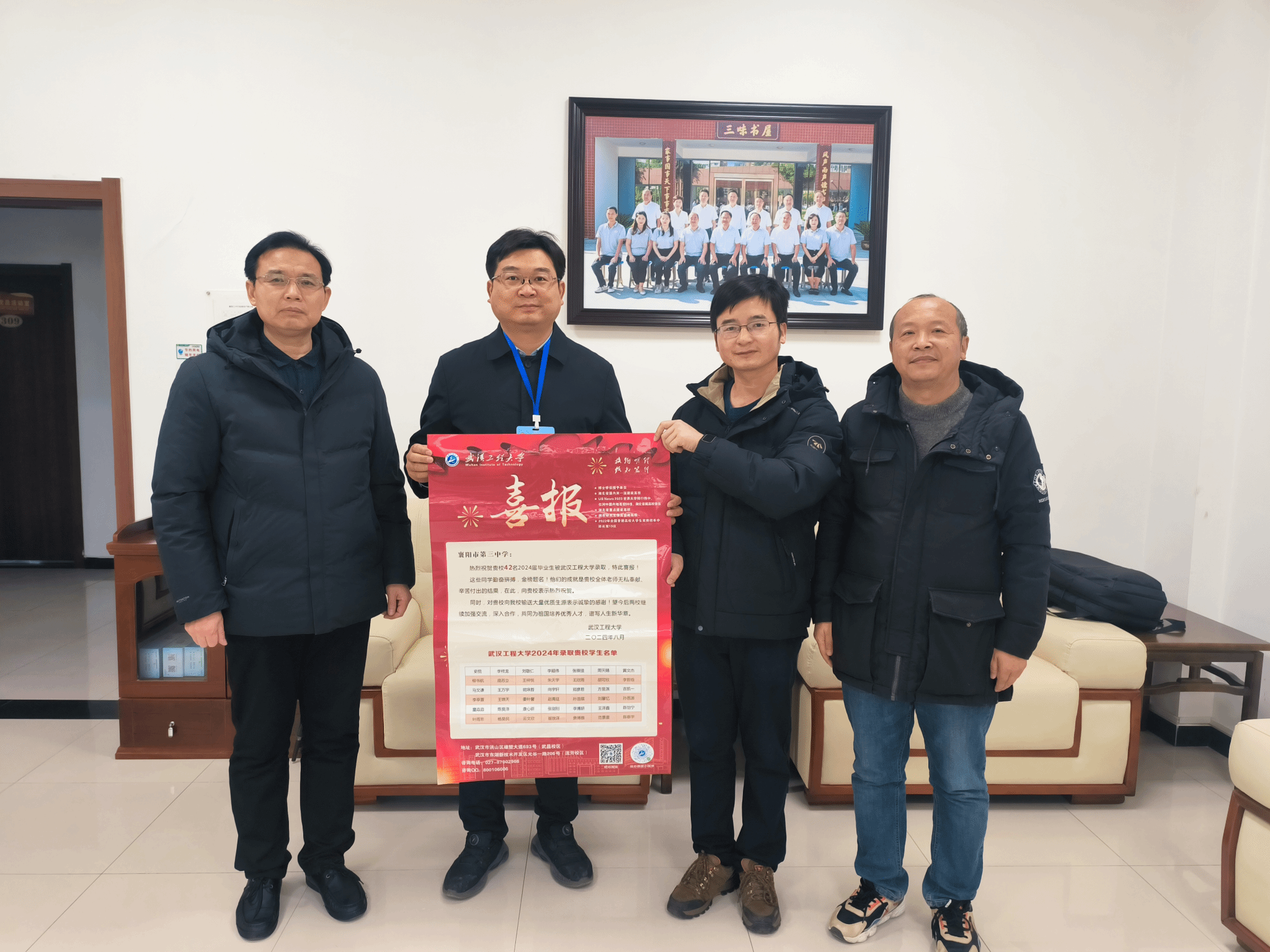 周磊代表学校向襄阳三中送去喜报,祝贺襄阳三中42名优秀毕业生2024年被武汉工程大学录取,对该校持续输送优质生源到武汉工程大学表示感谢。他围绕学校历史沿革、人才培养、办学特色、学科专业、招生政策、考研就业情况等方面内容进行了详细介绍,希望未来有更多三中的优秀学子进入武汉工程大学学习深造。