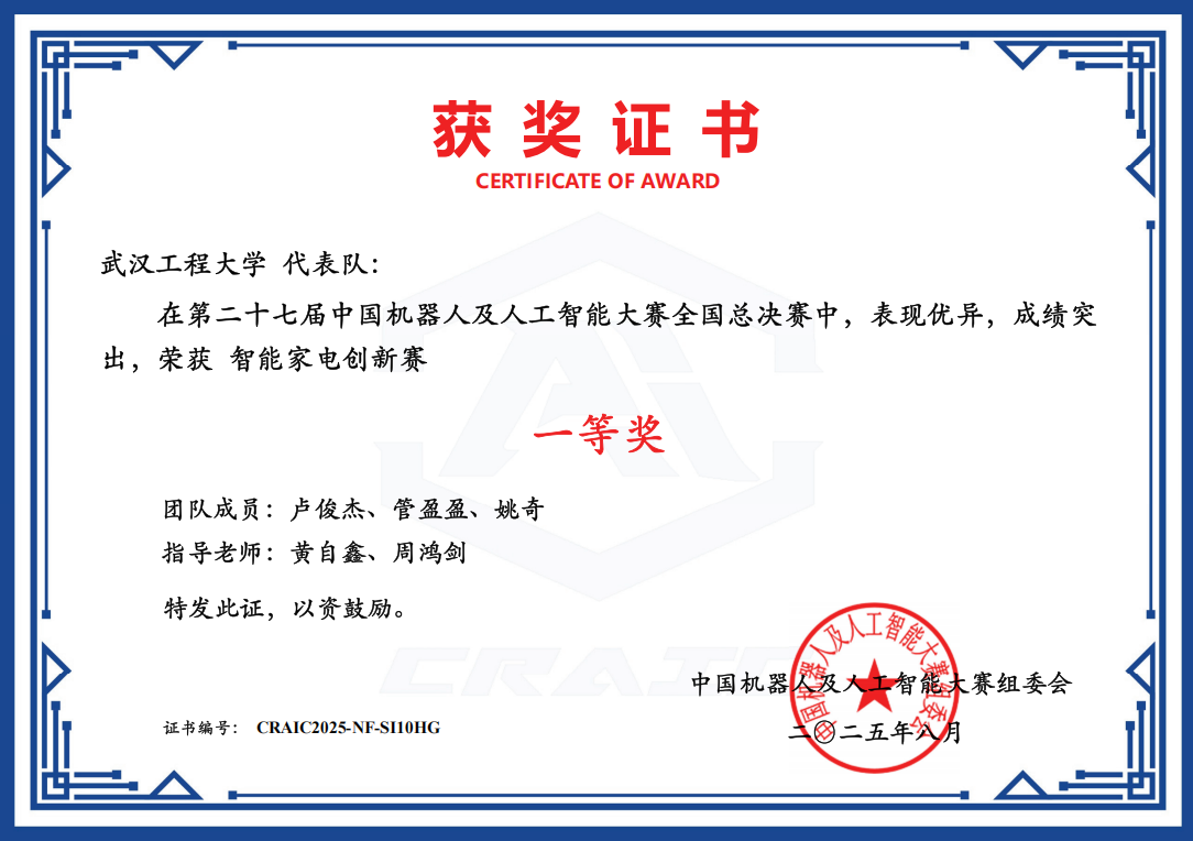 本网讯(通讯员 管盈盈 张翼)近日,第二十七届中国机器人及人工智能大赛全国总决赛圆满收官,由我校伟德(bevictor)官方网站黄自鑫老师指导,卢俊杰、管盈盈、姚奇3位同学组成的代表队,从全国众多参赛队伍中脱颖而出,荣获该赛事全国总决赛一等奖,充分展现了我校学子在机器人与人工智能领域的创新实力与实践能力。