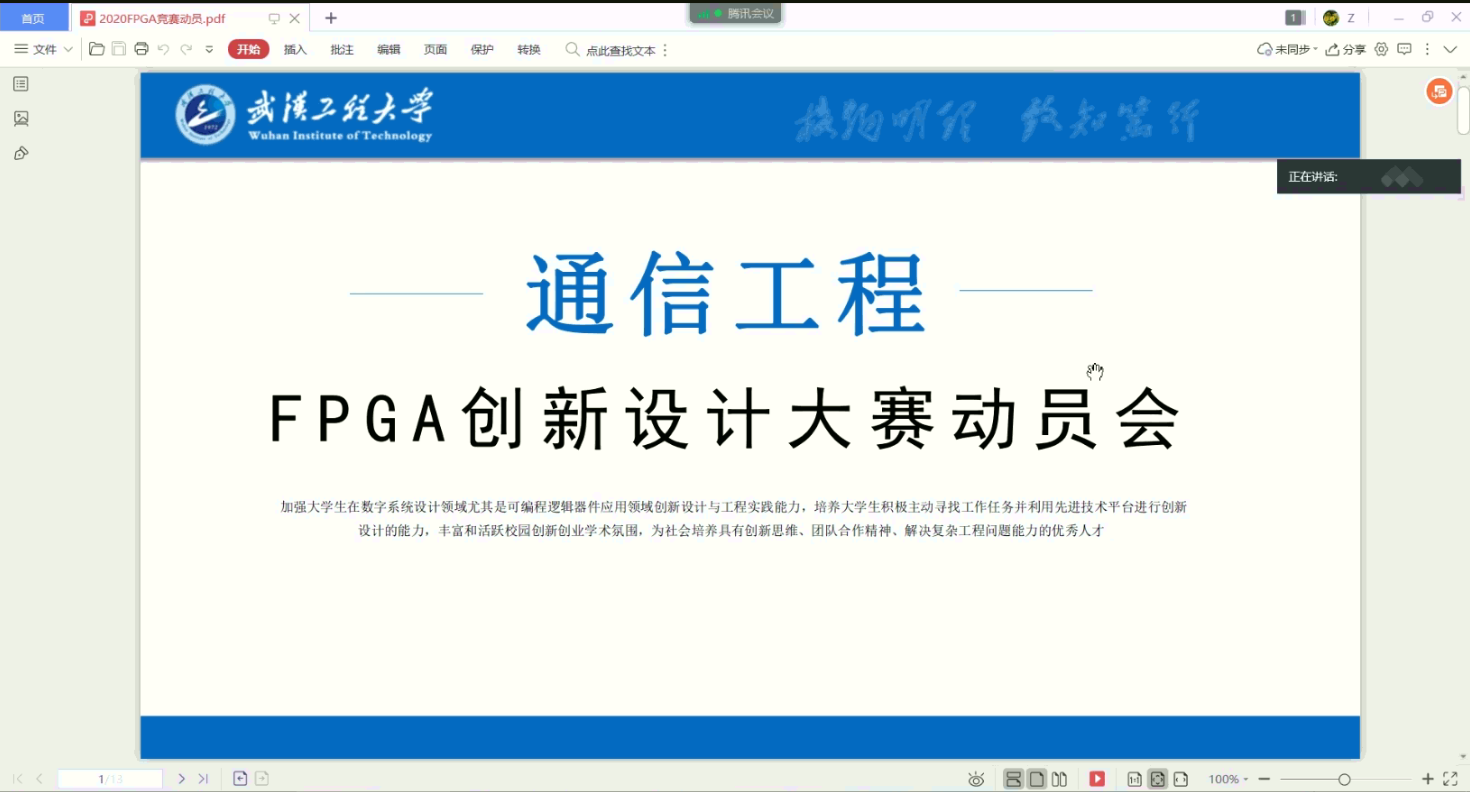 本网讯(通讯员 元海文)2020年 6月4日晚7点,通信工程系全体师生采用腾讯在线会议的方式顺利召开了第四届全国大学生FPGA创新设计大赛动员大会,并成功邀请到大赛赞助商——广东高云半导体科技股份有限公司专家代表参与互动指导。