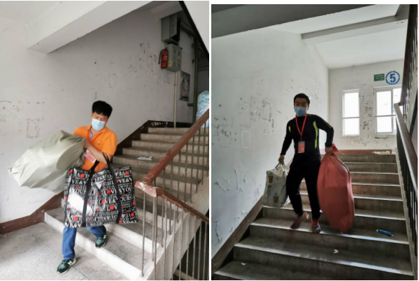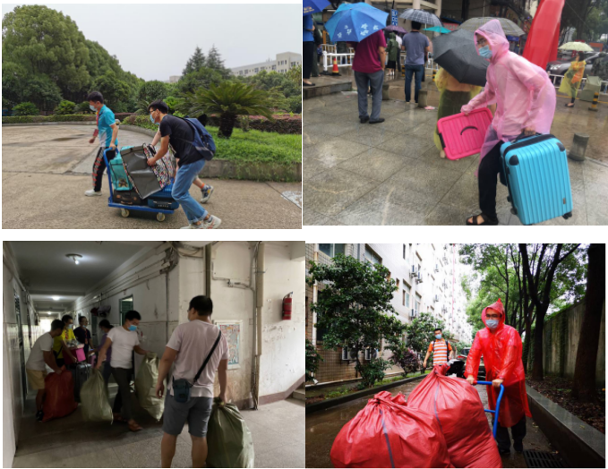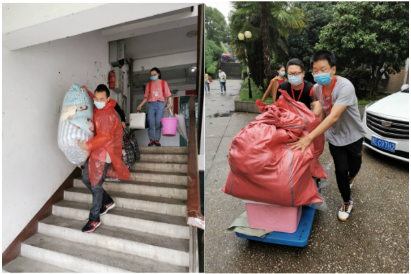 一趟又一趟,一次又一次,穿梭在学生寝室的老师们,成为了最靓丽的风景。虽有汗水和雨水的“交杂”,虽有腰酸背痛的“后遗症”,但教师党员们却毫无怨言。“绝对不能累坏了我们的学生”、“能送一送我们的毕业生,是一件有意义的事情”、“确实很累,但也觉得很值得”……学院教师说道。