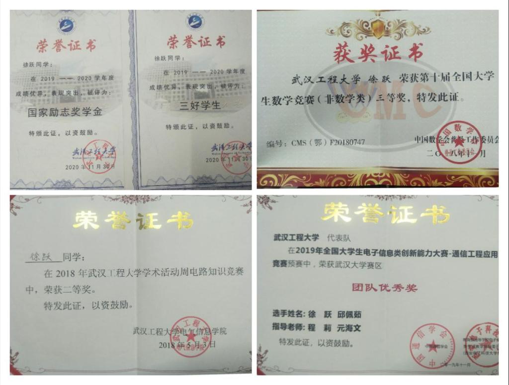 2017年9月,刚步入大学的徐跃并没有给自己设定什么远大的目标,只希望每个学期都有所进步。她在学业上从不“划水”,课堂上,坚持上课认真听讲,课余时间,阅读大量资料,整理笔记,确保老师上课所说的内容都能化为自己实际应用的知识。大二时,徐跃认真思考自己之后的毕业去向,并下定决心要考入自己梦想的学府读研究生,继续深造。有了明确的目标自然就有清晰的规划和前行的驱动力,她慢慢在学科竞赛上锤炼专业能力,“以赛致用,以赛促学”。曾获得全国大学生数学竞赛三等奖、中国高校计算机大赛网络技术挑战赛二等奖、校电路知识竞赛二等奖等诸多课外竞赛奖项。