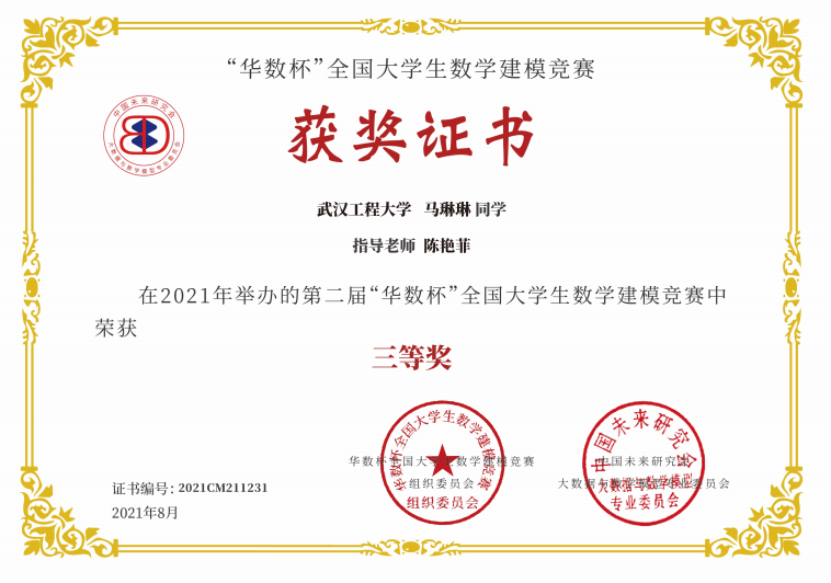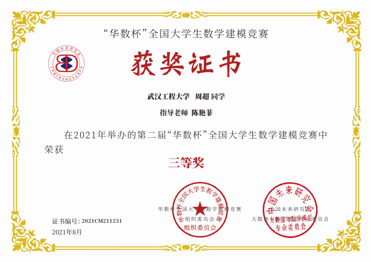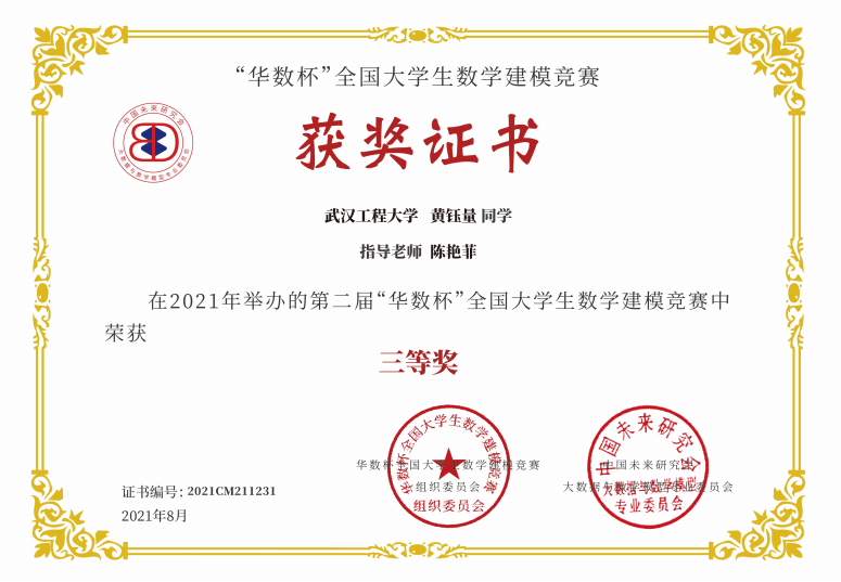 本网讯(通讯员 黄光亮)8月25日,由华数杯全国大学生数学建模竞赛组委会、中国未来研究会大数据与数据模型专业委员会主办的第二届“华数杯”全国大学生数学建模竞赛公布成绩。由伟德(bevictor)官方网站研究生黄钰量、周超、光能数理学院马琳琳组成的团队在该项比赛中荣获全国三等奖。