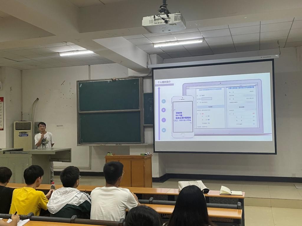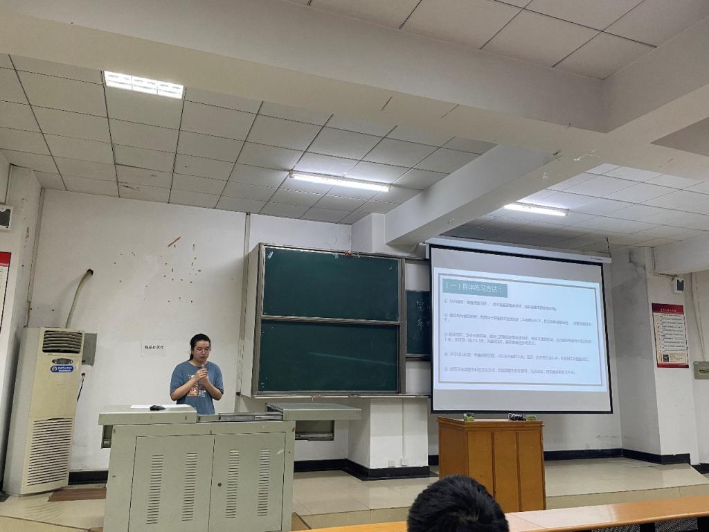 郭进伟同学从备考常识、各题型技巧、备考建议和个人寄语等四个方面做了汇报分享。他提出写作应当内容结构和表达兼备、听力应遵循所听即所得、阅读要按照顺序且明确出题规律、翻译时在充分理解题意的基础上转换译法,分译和合译并存。之后,他给出了适合同学们三个月备考的建议,分题型为大家做了详细介绍。