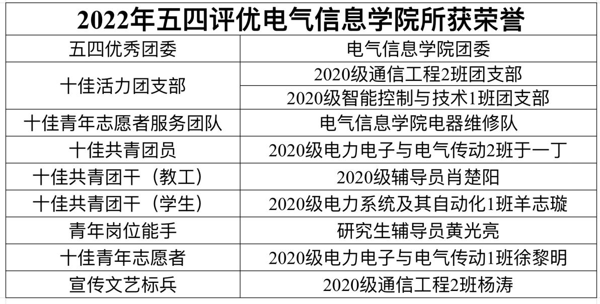 本网讯(通讯员 肖楚阳)近日,在校团委举办的2022年“青春心向党·建功新时代”五四表彰大会中,我院团员青年学工干部团支部、志愿服务团队及学院团委荣获多项荣誉,集中展现了电气师生的风采