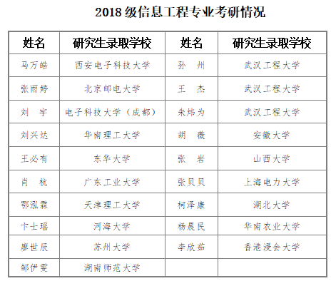 在培养模式上,自首届学生开始坚持实施学业导师制度,规划个性化培养和学业生涯,注重学生实践能力培养。近3年信息工程专业学生获各类学科竞赛全国一等奖3项,主持国家级创新创业训练项目1项、省级创新创业训练项目11项,就业率保持100%。从2020第一届毕业生到2022第三届毕业生,考研升学率逐步上升,2018级信息工程专业毕业生31人,考研录取19人,分布17所高校,其中58%为“双一流”高校。