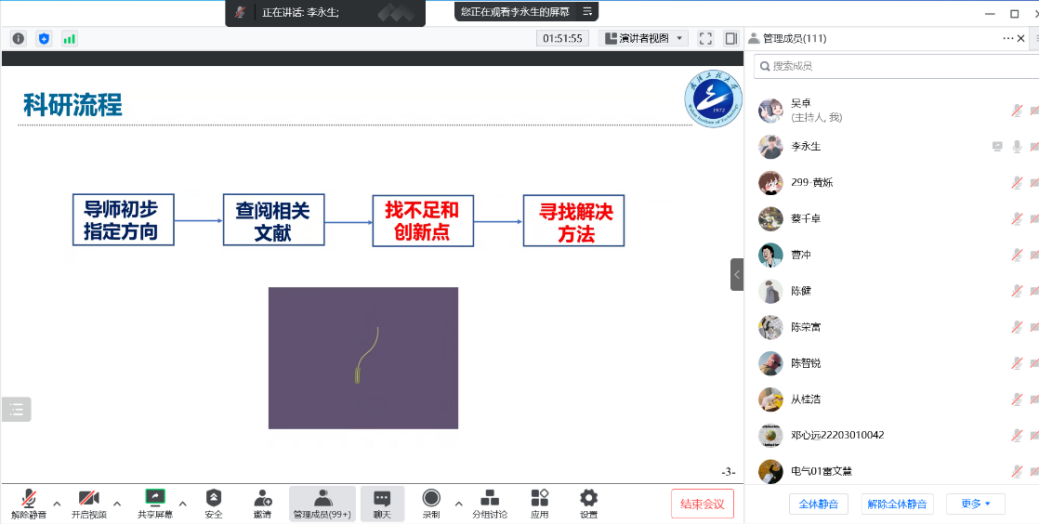2021级国奖获得者朱子凡结合自己的经验分享了科研的感受,首先他讲述了自己如何查找文献,如何管理文献,如何撰写文章,如何发表文章。成功是留给有准备的人,他建议做学术研究要持之以恒,并强调无论遇到什么困难都应该坚持实事求是,不能弄虚作假。