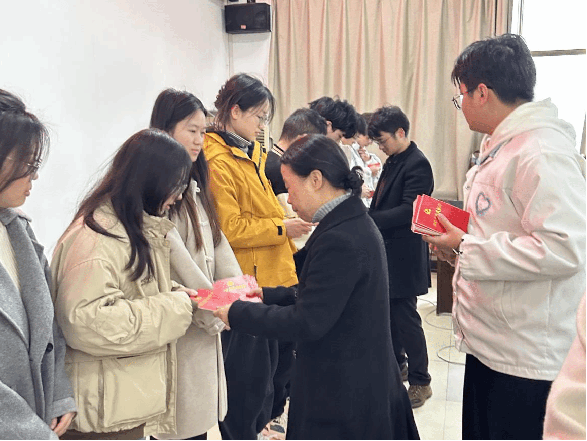 学院领导、组织员老师为新发展党员逐一佩戴中国共产党党员徽章,并赠送《中国共产党章程》。
