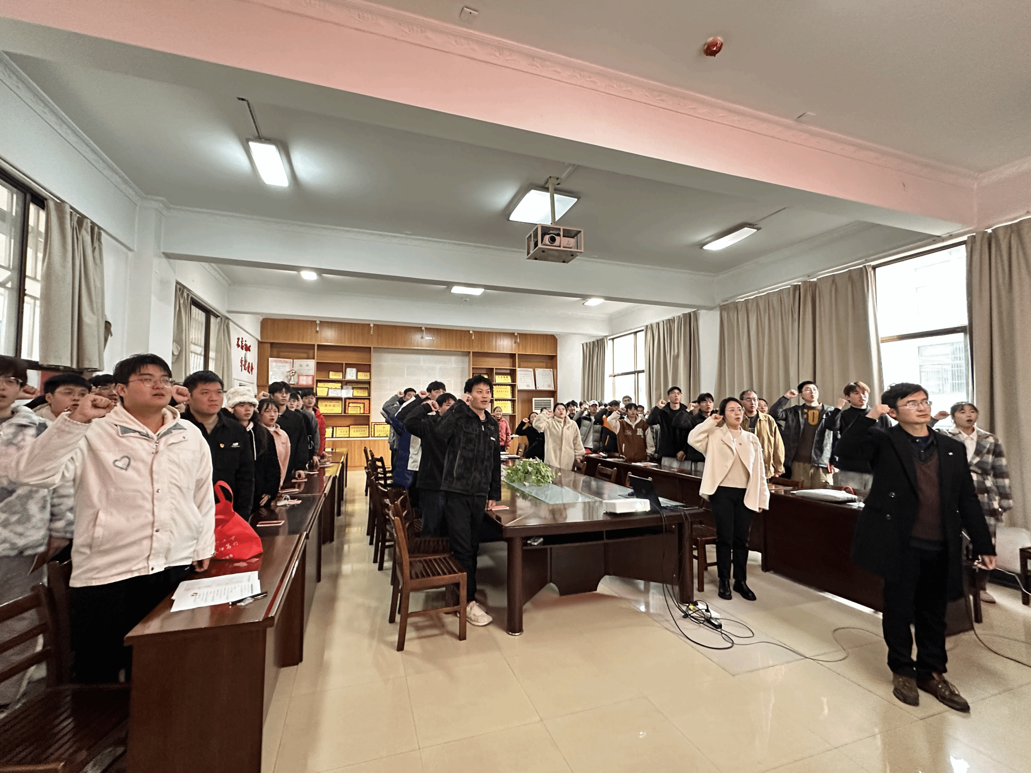 活动在庄严的国际歌中揭开序幕。周磊宣读2024年下半年新发展党员名单。今年下半年,学院有1名教师,36名本科生,17名研究生,共53名师生加入党组织。