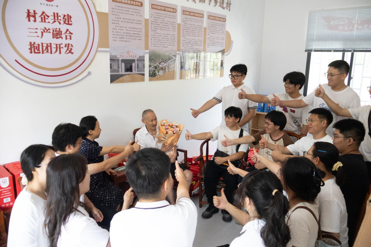 在叶河村党群服务中心,师生代表与91岁抗美援朝老兵袁成永深刻对话。老人生动讲述了战场上的生死时刻,谈及如今和平年代,他嘱托青年学子,“你们要听党话、跟党走,学好专业知识报效祖国!”全体成员与老兵齐声高唱《没有共产党就没有新中国》。杨俊杰同学动容地说:“老兵的嘱托是一堂最生动的思政课,我们将永远铭记历史,勇担时代重任。”