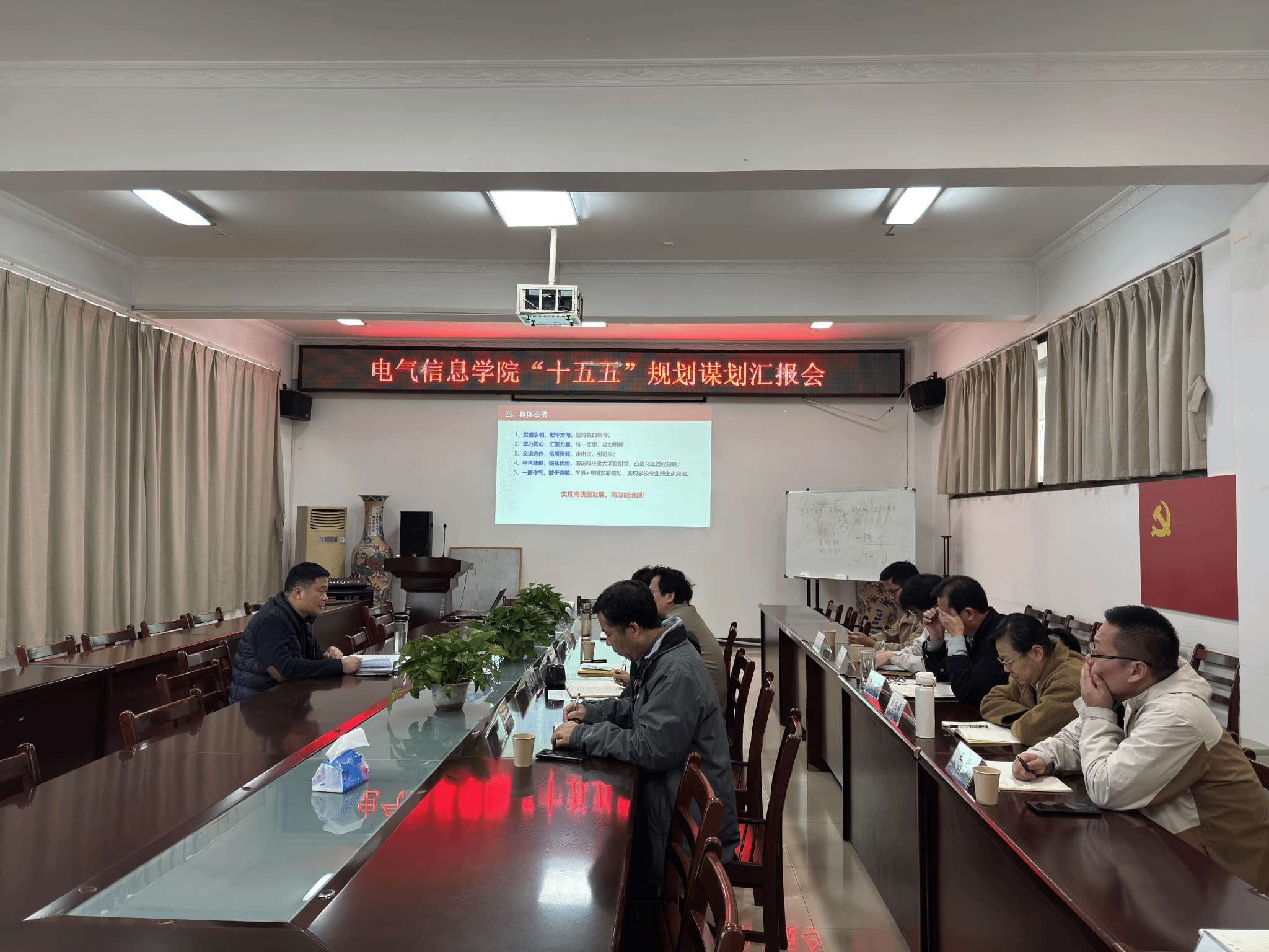 朱青林认真听取了汇报,并不时就关键问题与参会人员深入交流,详细了解规划制定的依据、可行性以及存在的困难。他对学院在“十四五”期间取得的成绩予以充分肯定,对全院上下为学校学院高质量发展所付出的努力表示高度认可。结合国家战略发展需求以及学校“十五五”规划谋划的整体发展目标,朱青林对学院“十五五”规划谋划工作提出了指导性的意见与要求:一是学科布局优化要早谋划早启动。以申报电子信息专业博士点为核心目标,以控制科学与工程学科提档升级为重点任务,补齐短板,整合资源,强化学科特色与优势方向的培育。二是高层次人才引育要加大力度加快步伐。学院领导班子要统筹谋划,统一思想,凝聚共识,在学校“人才工作年”中实现学院高层次人才质量上有提升,数量上有突破的目标。三是科研创新要敢想敢突破。聚焦国家重大战略需求和区域经济社会发展需要,在模式识别与智能系统,导航、制导与控制等学科方向形成自己的国防研究特色,同时发挥学校化工学科优势,在化工过程自动化与测量方面打造具有行业影响力的标志性成果。四是队伍建设要重心下移激发活力。打造一支有思想有情怀的教师队伍,有宽广胸怀和远见的干部队伍,打通青年教师的成长通道,是学院可持续、多元化发展的关键。