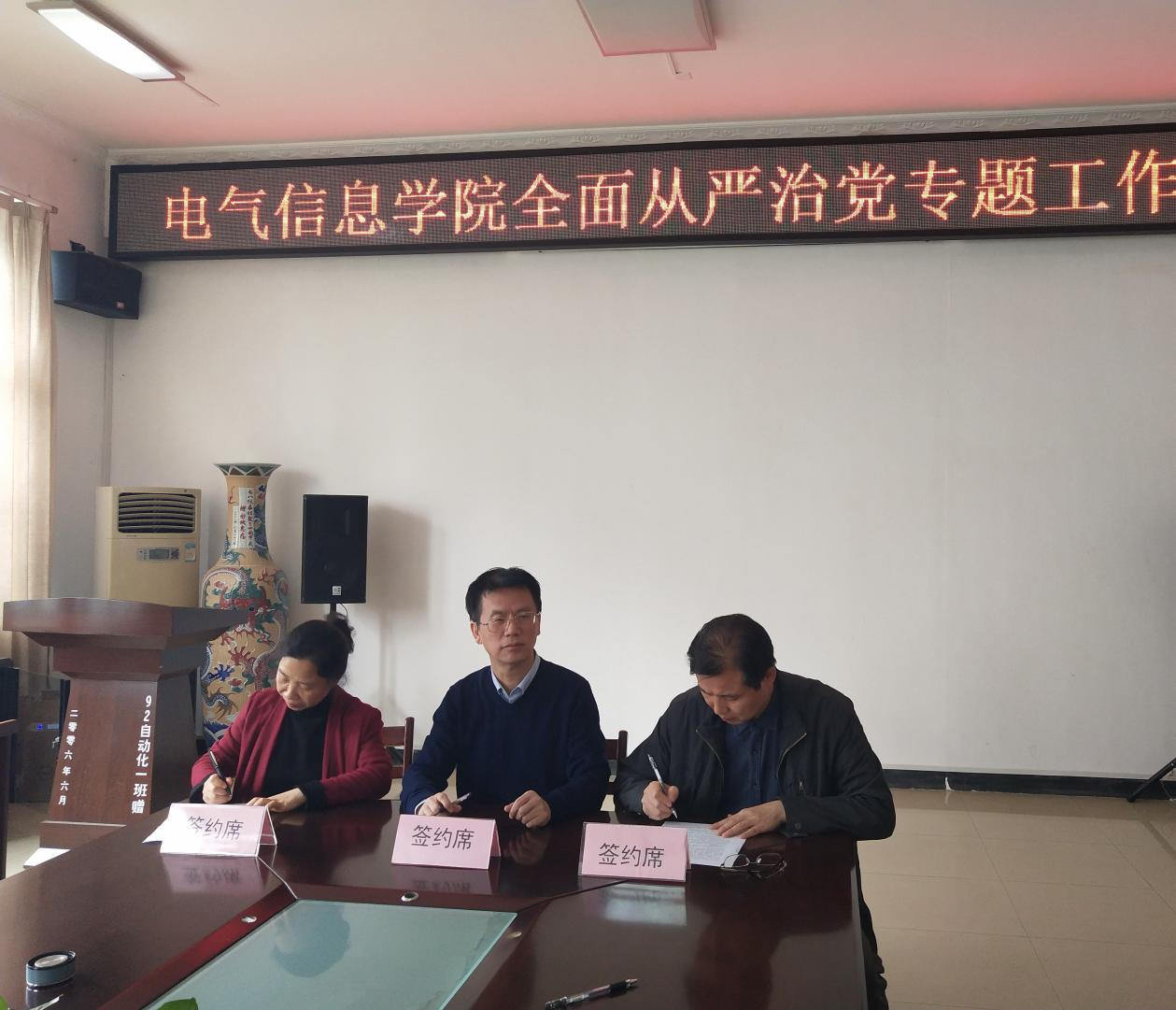会上,学院党委书记谢春晖与班子成员签订了“一岗双责”责任书。院长洪汉玉、院党委书记谢春晖与学院系部代表测控技术与智能感知系系主任卓旭升签订了党风廉政建设责任书。