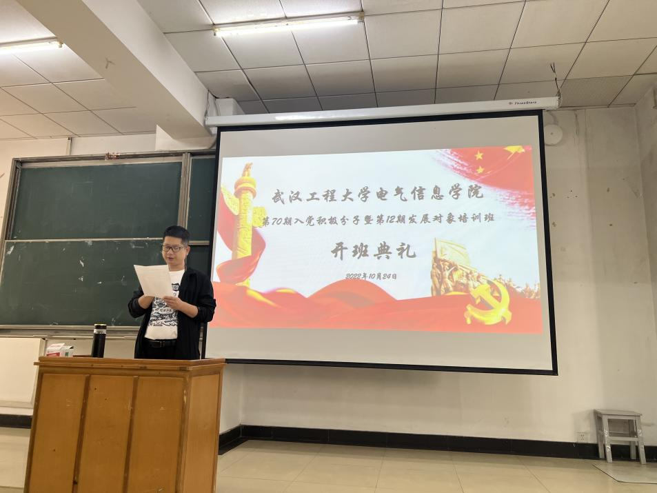 本网讯(通讯员 黄光亮)10月24日下午,伟德(bevictor)官方网站在流芳校区3119教室举行第70期入党积极分子暨第12期发展对象培训班开班典礼。学院党委书记谢春晖、党委副书记李国保、学生党支部书记以及所有参训学员参加了会议。会议由本次分党校培训班班主任黄光亮主持。