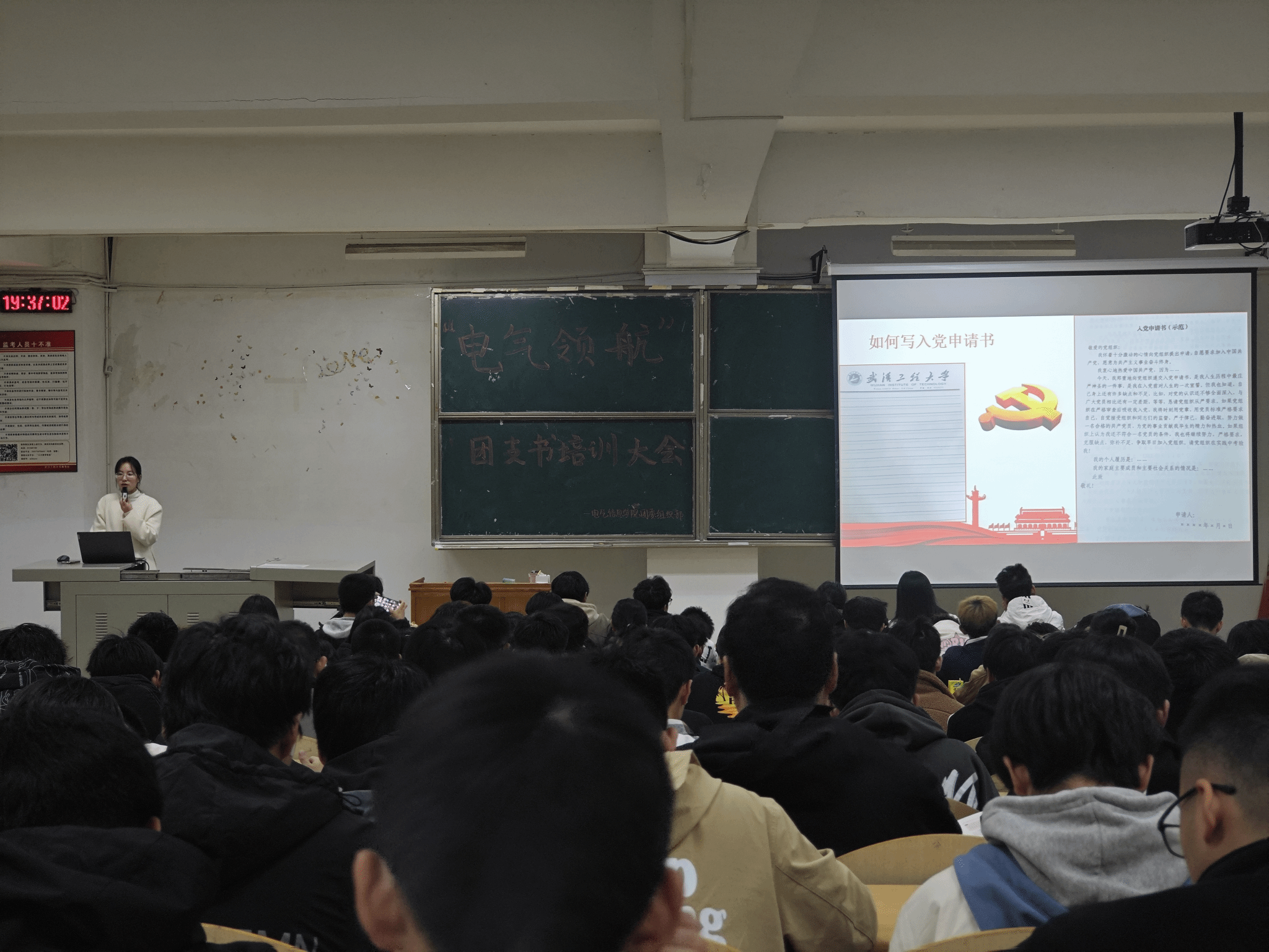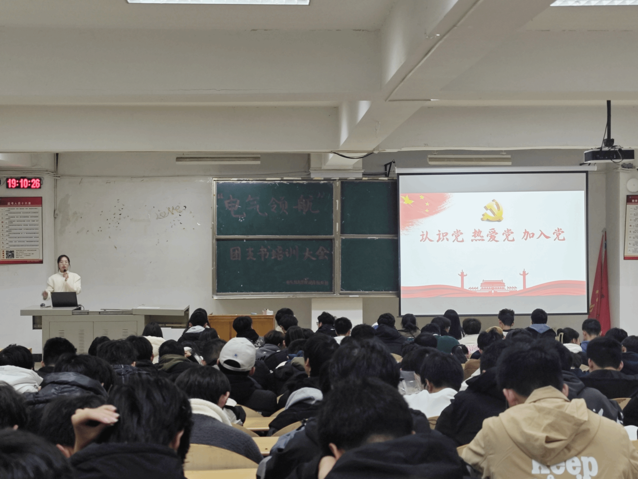 本次会议围绕“学榜样、认识党、热爱党、加入党”四个方面展开,邬老师首先分享优秀学生党员代表的故事,重点讲述优秀榜样学生的事迹,阐述了当代青年的使命和责任,从党的事业发展需要青年力量,鼓舞广大青年向榜样学习。青年的成长也需要党的培养,为了让新生加深对党的认识,随后邬老师带领同学们重点学习了中国共产党从诞生到强大的过程,回顾了党的百年奋斗历程,中华民族能够实现从站起来、富起来到强起来的历史性飞跃,根本原因在于中国共产党的领导。作为新时代大学生要有作为中华儿女的骄傲和自豪,不断增强做中国人的志气、骨气、底气,树立为祖国、为人民永久奋斗、赤诚奉献的坚定理想。最后邬老师还详细介绍了入党流程,细致地讲解了从递交入党申请书、入党积极分子的确定和培养、发展对象的确定和考察、接收预备党员、转为正式党员五个入党步骤,并为同学们讲解如何规范撰写入党申请书,加入党组织是一个人追求先进、要求进步的重要表现,希望大家积极向党组织靠拢,为党的事业注入新鲜血液和青春力量。