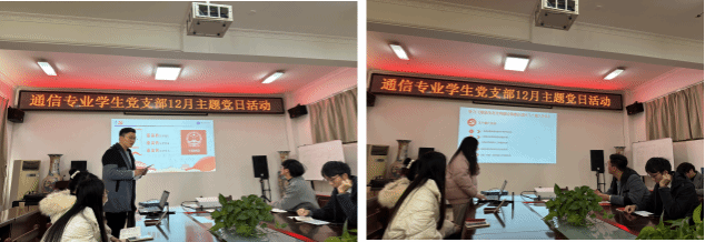 本网讯(通讯员 周雯琪)12月27日下午,通信专业学生党支部全体党员、入党积极分子代表在学院319会议室组织开展12月主题党日活动,本次会议由支部书记周雯琪主持。