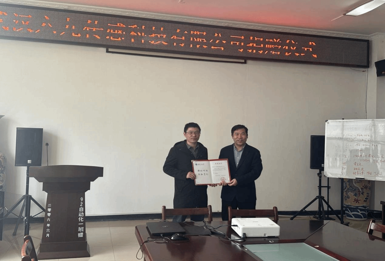 在参会师生的见证下,副院长李自成为07级校友高攀颁发了捐赠证书。此批检测板将主要用于学生开展学科竞赛和科技创新之需使用。