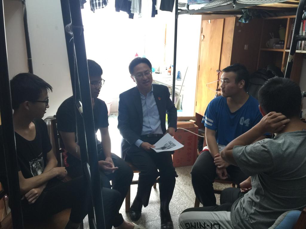 来到宿舍,张校长仔细询问了同学们的学习和生活情况,同学们向张校长汇报了自己进入大学一年多以来的学习、生活、工作情况以及未来的规划。张校长对该宿舍4位同学一年多来取得的成绩和进步表示欣慰,同时针对每名同学存在的不足提出了建议和要求。对同学们学习有困难的课程,张校长还结合自身学习经历,分享了学习经验和方法,勉励同学们要正确认识学习、生活中遇到的困难;要珍惜时间,珍惜大好青春,将自己的主要精力放在学习上;要合理规划,既要有短期目标,也要有长远的规划,广泛涉猎各种知识,努力实现人生梦想。