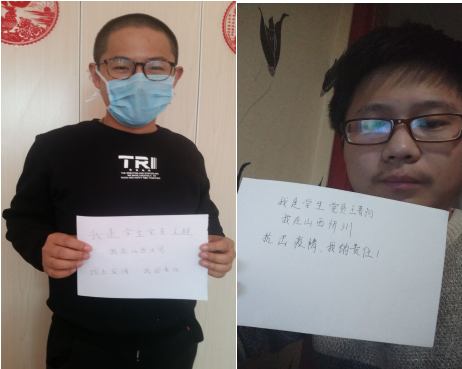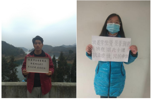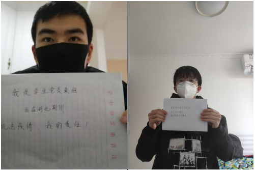 会议结束后,支部党员为亮明身份,助力防疫,分别拍摄照片和视频,并制作成了“电信支部党员与你同在”的主题视频。一张张白纸清晰地写着“我是学生党员XXX,我在XX,抗击疫情,我的责任”,一句句激情澎湃的“我是党员!”、“加油!”激励着大坚定信心,保持定力,做好榜样,服务他人,发挥学生党员的排头兵作用。
