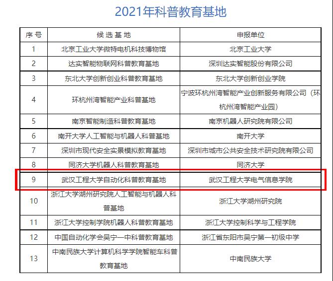 本网讯(通讯员 黄自鑫 邓婕)近日,2021年中国自动化学会科普教育基地公布评审结果,“武汉工程大学自动化科普教育基地”成功入选。