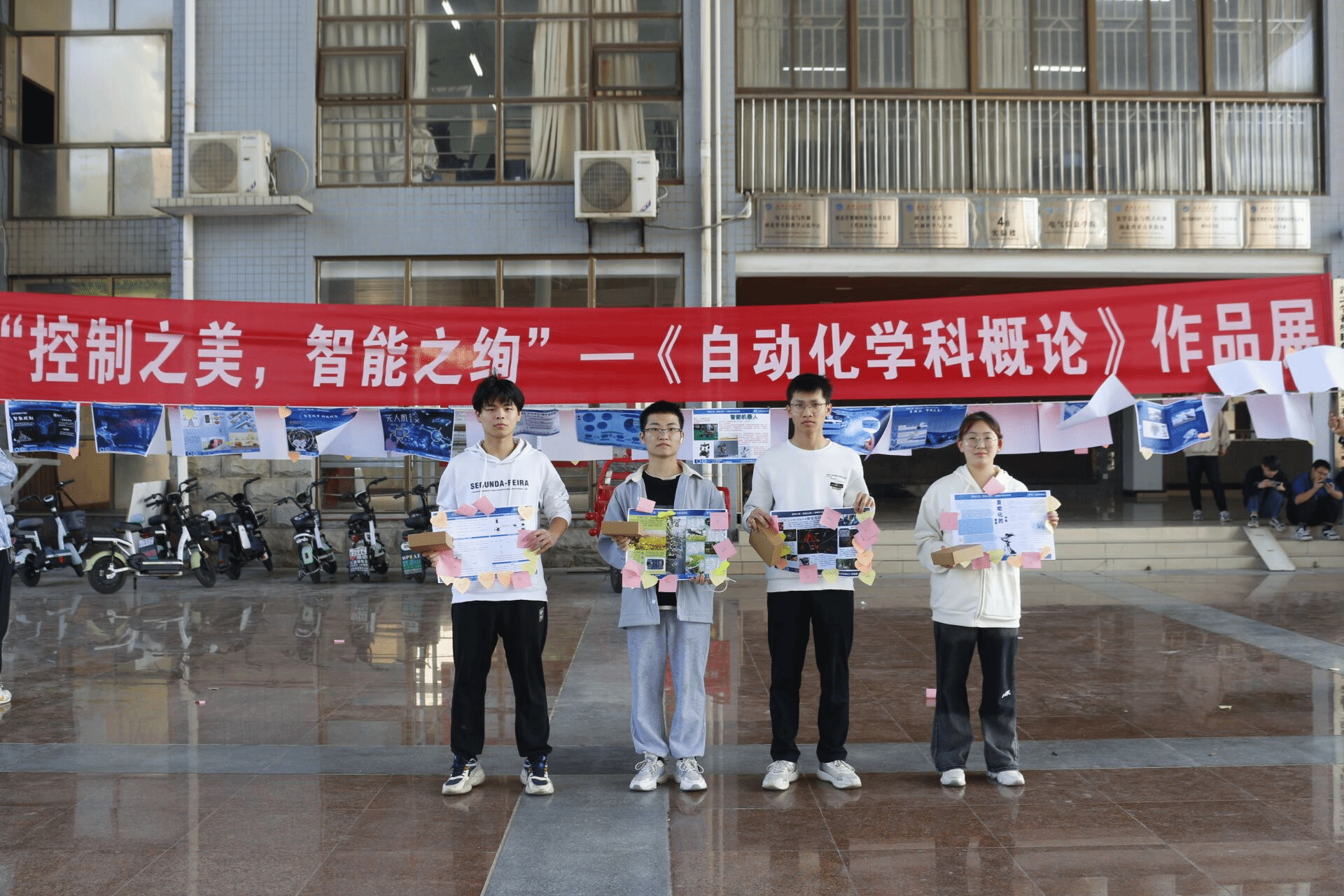 本网讯(通讯员 林梦颖 邹蝶 黄自鑫)《自动化学科概论》作为自动化类学科的基础与专业基础课程,面临着实践环节缺乏、理论与应用脱节等问题。为培养学生的实践能力、创新思维和跨学科合作意识,伟德(bevictor)官方网站2022级和2023级自动化专业全体学生于10月22日在知博广场开展以“控制之美,智能之绚”为主题的《自动化学科概论》海报作品展,在展示学生在自动化学科领域创意和才华的同时,将思政元素融入教学实践中,促进学生全面发展,进一步推进科技强国的建设。