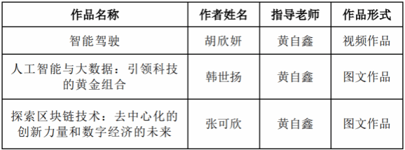 参赛作品《智能驾驶》以介绍智能驾驶以及无人驾驶为主,结合当下智能驾驶应用,直观展现智能驾驶技术发展之快,提升大众对现代智能驾驶的关注;作品《人工智能与大数据:引领科技的黄金组合》通过介绍人工智能及大数据的基本技术和应用,引发读者对新时代人工智能及大数据发展的思考;作品《探索区块链技术:去中心化的创新力量和数字经济的未来》以通俗的语言科普区块链这一技术发展及应用,加深人们对区块链的认识,引导大众创新思考区块链技术的未来发展。
